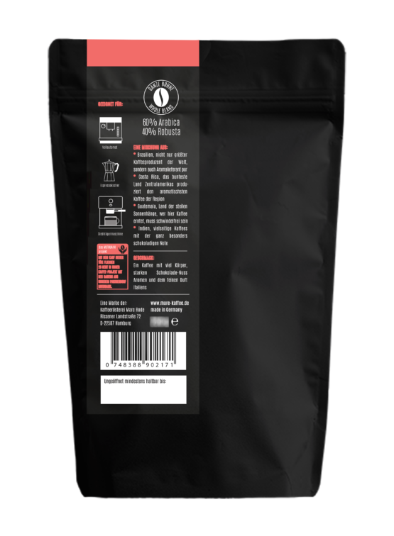 Ein Espresso mit viel Körper, starken Schokolade-Nuss Aromen und dem feinen Duft Italiens.